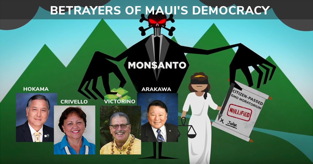 Betrayers of Maui Democracy Ask Voters to Re-Elect Them This November Arakawa, Victorino, Crivello, and Hokama Enabled Monsanto’s Historic Theft of Voter-Approved GMO Moratorium