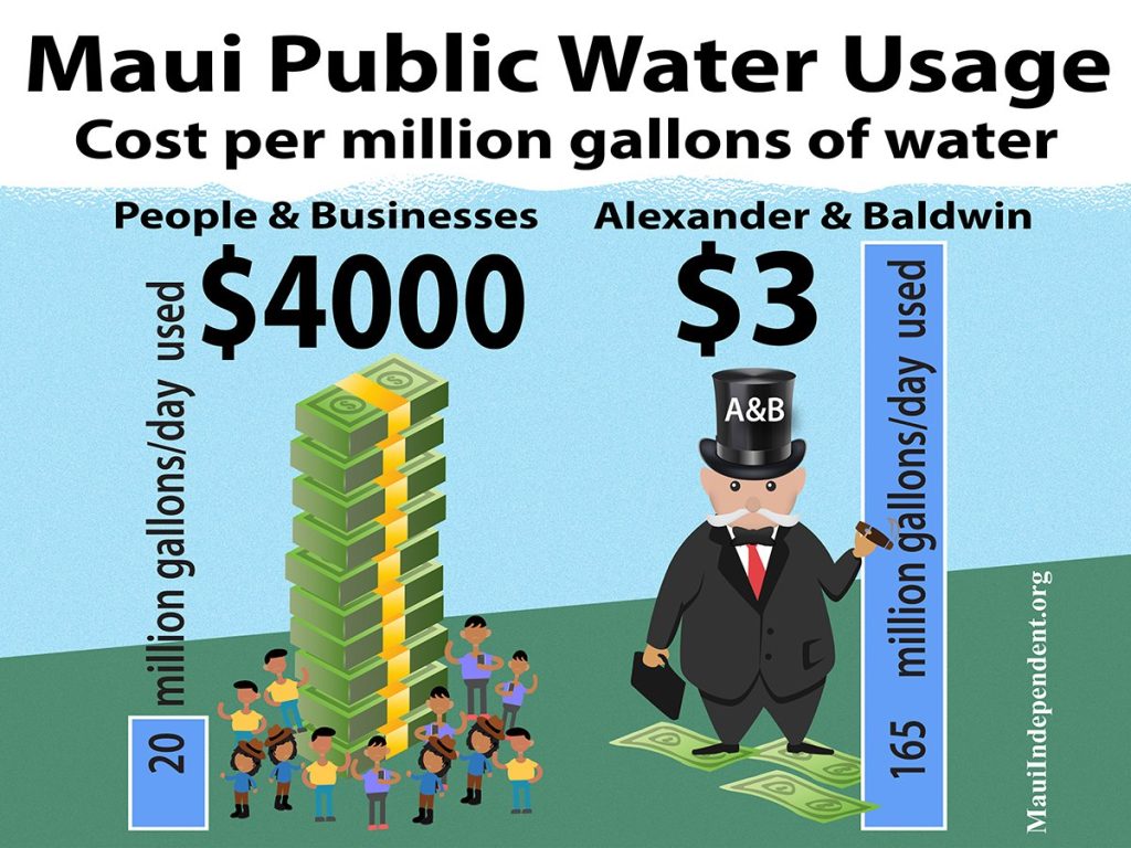 Most of Maui’s fresh water has been controlled by the Alexander and Baldwin (“A&B”) company since it completed a massive 17 mile aqueduct in 1878 that carried water from the rainy region of East Maui to the plantations in the east. As the Maui Independent revealed in this startling expose six years ago, A&B consumed more than 80% of all public water used in Maui for more than a century. During the final field-burning years of Maui’s massive sugar plantations, the state charged A&B, the largest public company in Hawai’i, just $3 per million gallons of water, while charging Maui’s small farmers, indigenous people and homeowners $4,000 for the same million gallons.