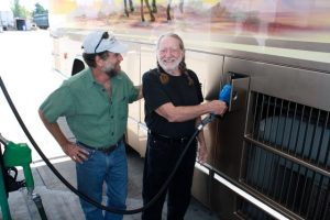 Bob King with country legend Willie Nelson pumping biodiesel into Willie’s tour bus.